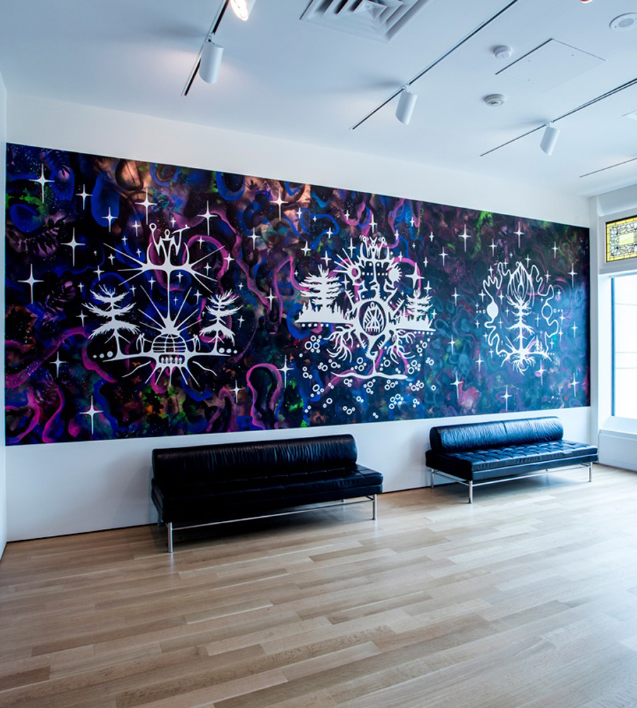 Nyle Miigizi Johnston’s Diiyah Muh’gaanag (Our First Family) is a collection of images of spiritual beings, plants and animals based on Anishinaabe teachings. Drawn in a pictographic style, they tell stories of botany, astrology and the interconnectedness of all living things.